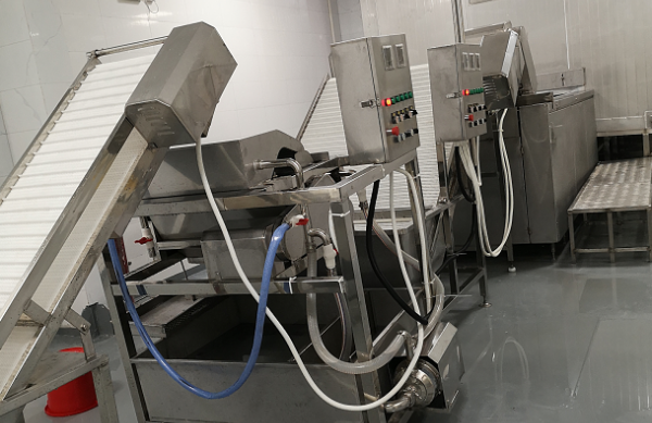 隧道式連續(xù)速凍機(jī)主要由隧道體、蒸發(fā)器、風(fēng)機(jī),料架或不銹鋼傳動(dòng)網(wǎng)帶等組成。被速凍的物料放在料架的各層篩盤(pán)中或網(wǎng)帶上通過(guò)隧道,空氣通過(guò)蒸發(fā)器降溫,然后送入隧道中,穿流于物料之間使其速凍,凍結(jié)物料的作業(yè)方法與隧道式逆流干燥設(shè)備相同;冷風(fēng)與物料在隧道內(nèi)的流動(dòng)方向相反,第一、二級(jí)傳動(dòng)網(wǎng)帶的運(yùn)輸速度可以分別控制,冷風(fēng)分別吹到網(wǎng)帶上,穿過(guò)物料層,再經(jīng)蒸發(fā)器與風(fēng)機(jī),循環(huán)使用。物料先通過(guò)第一級(jí)網(wǎng)帶,運(yùn)行較快,料層較薄,使表面凍結(jié);然后轉(zhuǎn)入第二級(jí)網(wǎng)帶,運(yùn)行較慢,料層較厚,使整個(gè)物料全部?jī)鼋Y(jié),得到單粒速凍產(chǎn)品,這種速凍機(jī)的特點(diǎn)是可以凍結(jié)產(chǎn)品的范圍廣,冷凍效率較高,沖霜迅速,清洗方便。